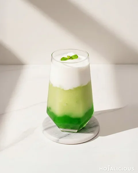 An exquisitely aesthetic Mint Vodka Cocktail filled with mysterious green energy, featuring a base of mint syrup and Vodka, brightened by lime juice. The bottom is layered with dark coffee jelly, followed by sparkling water for a light separation. Finally, mica powder is sprinkled on top for a subtle, starlight-like glow, creating a high-visual cocktail that appeals both in look and taste.