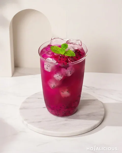 This lychee fruit tea blends the vivid colors of red and white dragon fruit with the gentle sweetness of lychee, creating a refreshing tropical tea that delights both the eyes and the taste buds.
