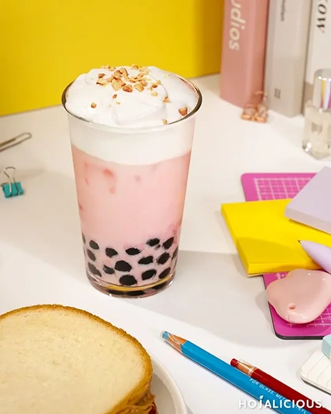 A playful blend of peanut butter cream, strawberry milk, and chewy brown sugar boba—bringing nostalgic PB&J flavors into a refreshing bubble tea experience.